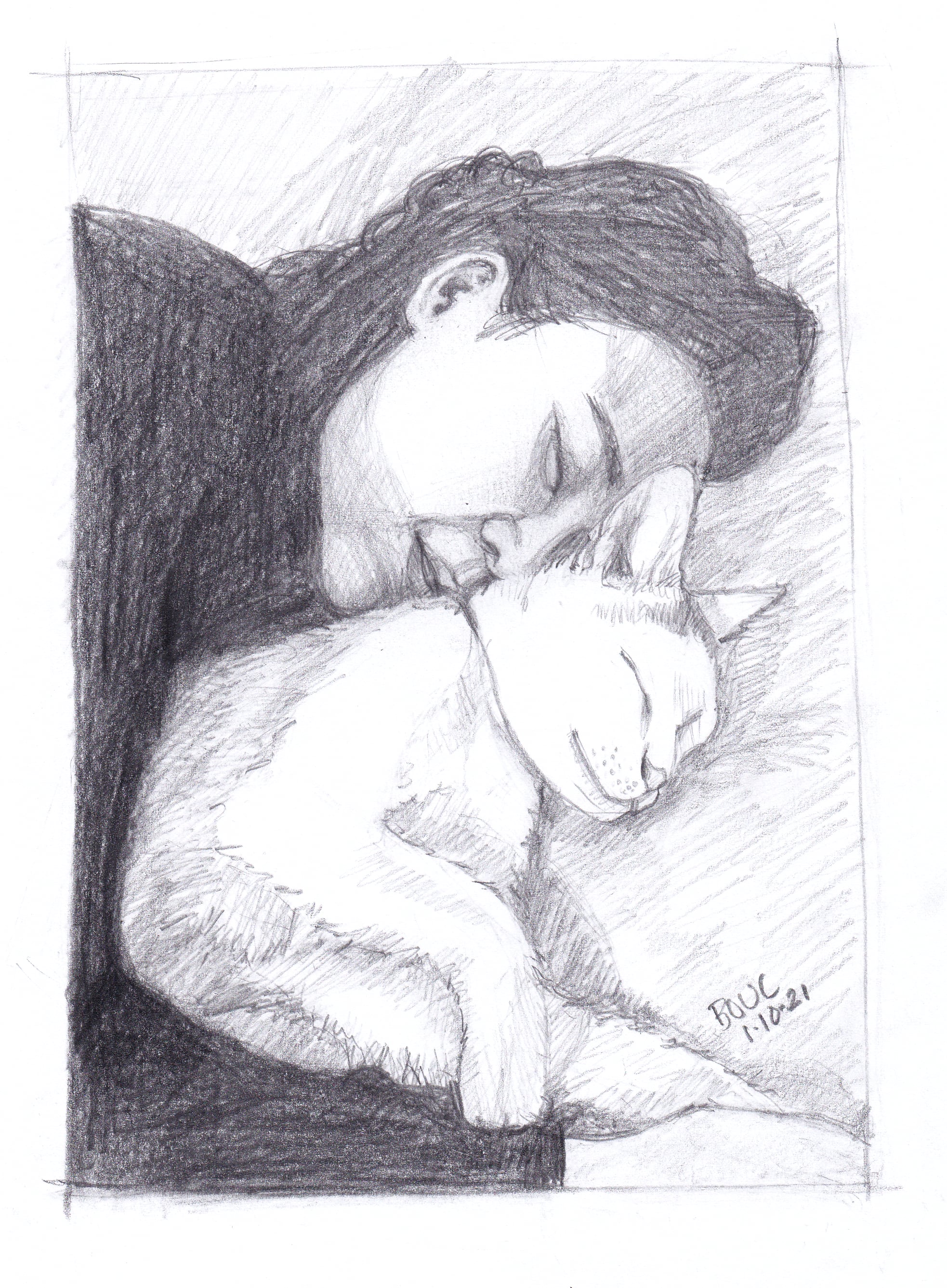 Cozy Sleepers on a Rainy Day, graphite on copy paper, 11×8.5″
