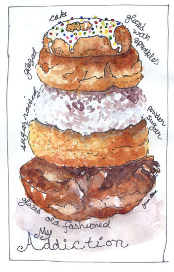 Luckily donuts are one of the few food addictions I do not have…however, I have to say your sketch makes me want to visit a Krispy Kreme. I especially like the sprinkles on the top!