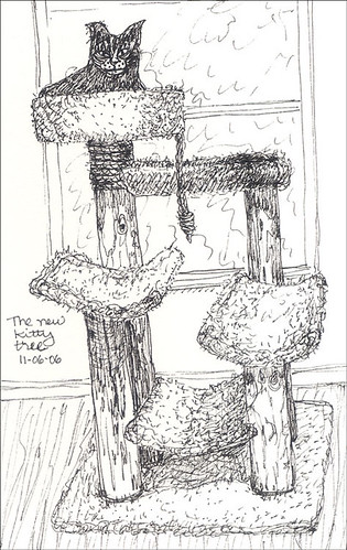 Love the “scratchy” drawing! A word of caution–the cat “tree” that I had tended to tip when my large cat jumped up onto it. It actually tipped and broke the window behind it (as yours is in the drawing); it was a nasty surprise. Second-floor (San Francisco house) windows are not easy to replace. Your tree does look sturdy, though.