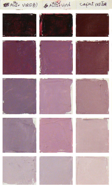 Gamblin was trying make a color as much like the original Alizarin as possible, but with all those different pigments it seems much duller when blended with white or with Viridian, as in the next chart on the right above. On that chart I mixed Viridian equally with those two Alizarins and then added white to those mixtures.