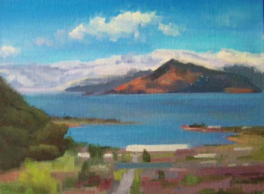 I did a little revising on the painting below, trying to work with the suggestions people offered. I think there are some improvements (I like the distant hills better and I toned down the sailboats and removed the sign and tried to make the town look more like buildings). I feel like I’ve taken it as far as it needs to go as a sketch.