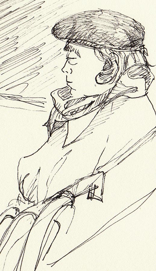 I enjoy sketching on BART, our subway system (which has been in the news since New Year’s Eve when BART police shot and killed a defenseless, unarmed young man which was captured on cellphone video and led to protests and rioting in downtown Oakland). BART’s headquarters are in the building where I work in downtown Oakland. To keep people safe inside, the building has been on “lock down” the past couple of weeks, with I.D.s required to enter the building to keep those of us working inside safe. There’s been no trouble though, with way more media and police around than protestors.