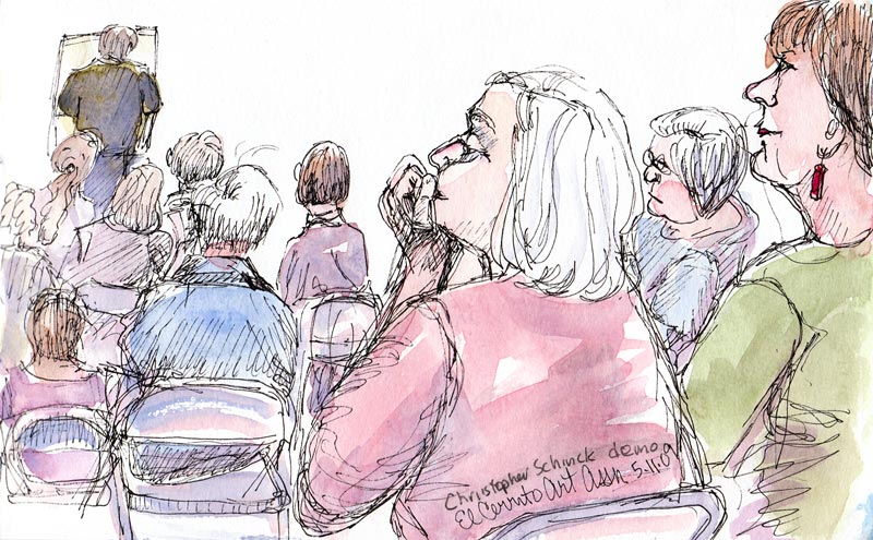 Last week the El Cerrito Art Association hosted an excellent watercolor painting demonstration by Christopher Schinck. Mr. Schink has a unique way of painting with watercolor and a wonderful sense of humor. He both entertained and amazed the group with his bold use of color, thick paint applied opaquely using large china bristle brushes and extraordinary knowledge of art history, composition and painting technique. I alternately watched the demo and sketched the audience (above), enjoying both equally.