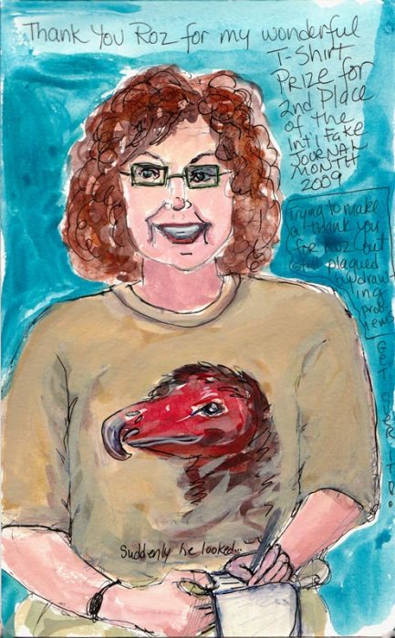 Thank You Roz! (Gouache & Ink) – sketch of me wearing my prize T-shirt for International Fake Journal Month