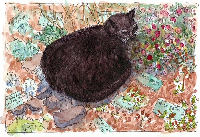 Walking to our critique, I spotted this garden kittie, having a nice nap in the buckwheat section of the garden and had to stop and sketch it. Nothing bothered this plump pussy who slept amidst the plants, little signs, wood chips and stones near the garden entrance. I added the whiskers with white gel pen.