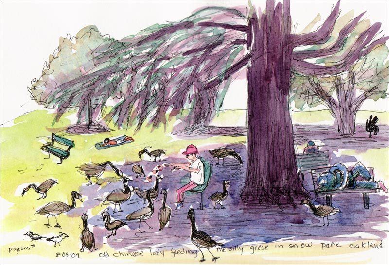 I meant to take a walk at lunch today but when I saw this old lady feeding the geese I had to stop and sketch. This is a little park near my office in downtown Oakland called “Snow Park” but a better name would be “Goose Poop Park” since it’s home to the many Canadian geese who don’t seem to feel the need to head north or south any longer.