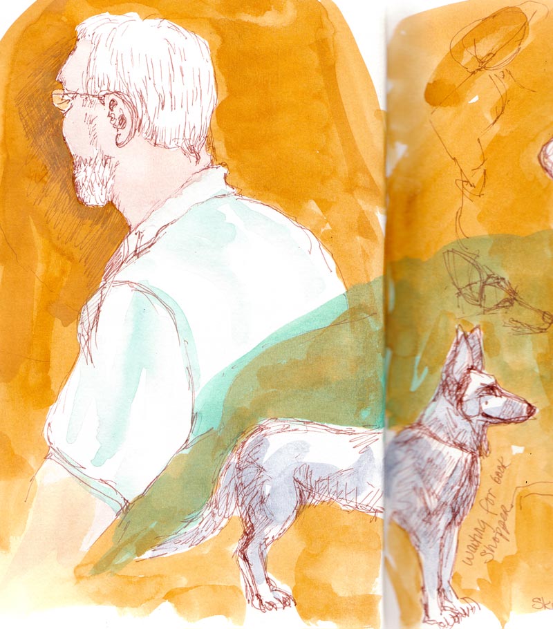He was waiting for his stop on the subway ride and she was waiting for her owner to come out of the book store on Solano. I used the gouache to hide the guy’s nose that I added by mistake. (It wasn’t visible at this angle but he turned his head and I said, “Oh, there’s his nose,” and sketched it in, and immediately saw it was wrong.) The gouache also nicely hides the false start of the dog and the waiter (see last picture below) too.