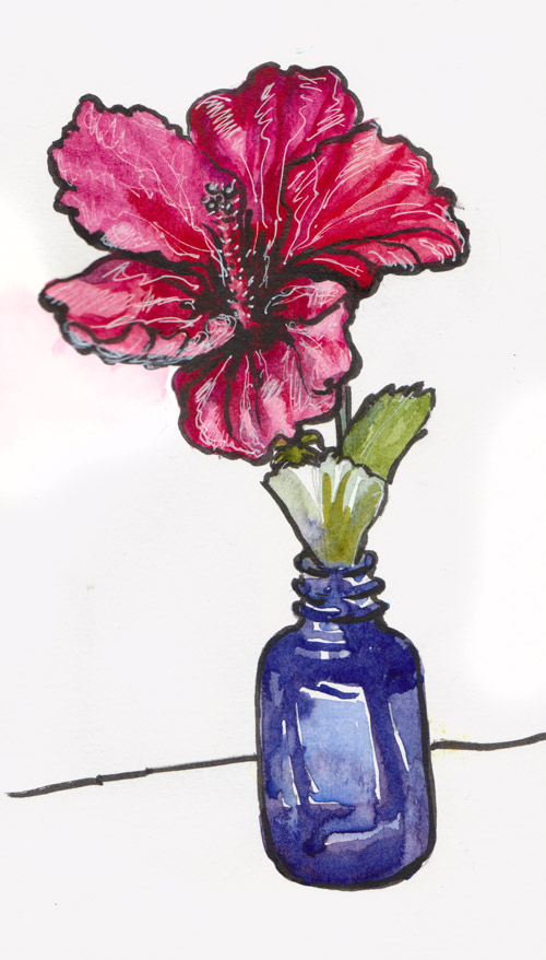So I sat myself down at the drawing table and just started writing in my sketchbook journal all the shoulds I was hearing in my mind (but who was saying them–aren’t I the only one in there?). When all else fails I default to flowers. I picked a hibiscus, stuck it in a little bottle and started sketching. I got it wrong. I drew with a pen dipped in ink, I added wax crayon, watercolor crayon, rubbed it with a paper towel, rubber stamps, more ink, more crayon, and just kept angrily abusing the page, trying to dump the shoulds.