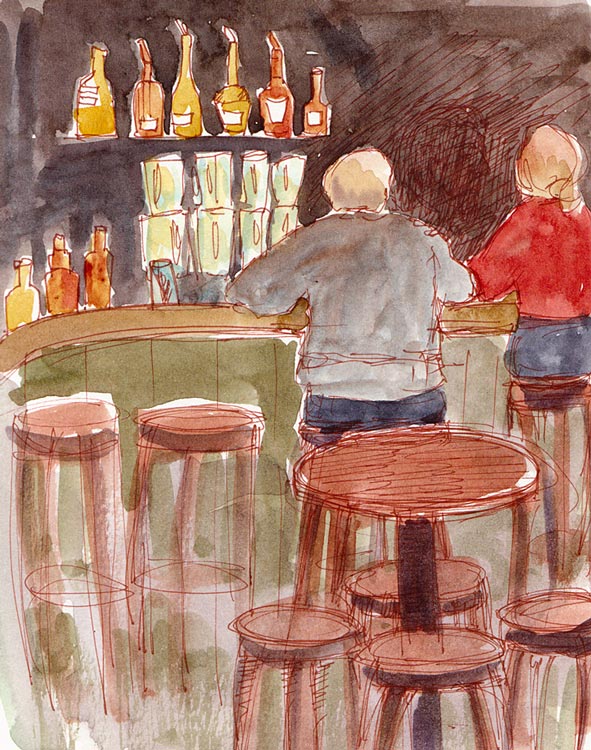 Cathy and I sat in tall comfy barstools along the back wall and sketched, creating a great deal of confusion for the bartender who couldn’t figure us out, though he didn’t seem to mind when we politely said, “No thanks” when he came over to take our orders. We just kept on sketching.