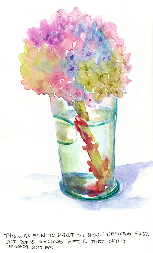 I love your hydrangeas! I love the different approaches, too. I think the second one is my favorite….I love that you painted it without drawing first!!!