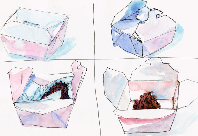 After struggling with sketching a coconut macaroon at Saul’s last night, I brought it home in a take-out container and then sketched it eight more times, in a duet with the takeout box.