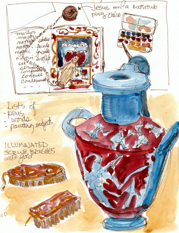 Her journals are full of travel sketches, copies of museum paintings, and lists of things like pen preference rankings, and titles for paintings. I loved the list “Paintings that Matter” that included titles like ‘When Hell Freezes Over,’ ‘Routine Inspection,’ ‘Unintended Consequences,’ ‘Road to Ruin’ and ‘Dressing the Turkey.” The show at CCA will be up through March 5 and on February. She will also give a talk at the Berkeley Art Center on Saturday, February 20, 2010 at 4:00 p.m.