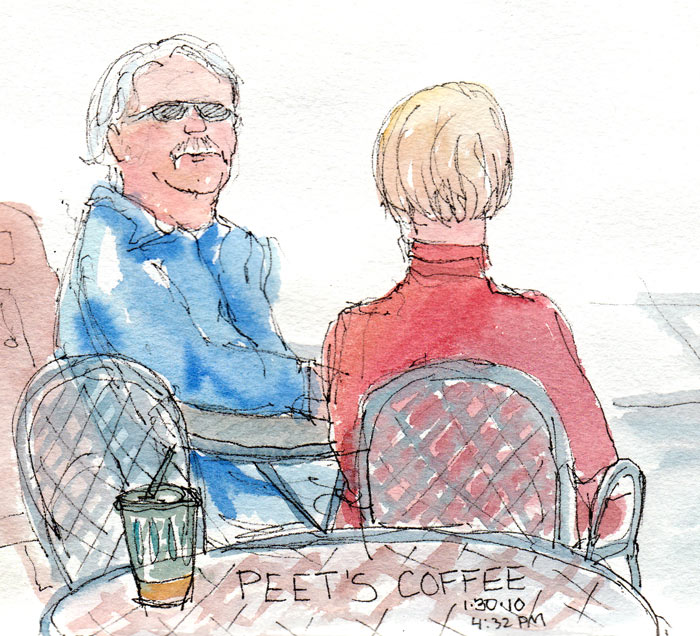 And what’s a nice walk on a spring-like day without a stop at Peets for a Cappuccino at a sidewalk table and a bit of sketching/painting. I’m still finding my way with this paper, trying to get a sense of how much paint to use, and which pens work best with it.