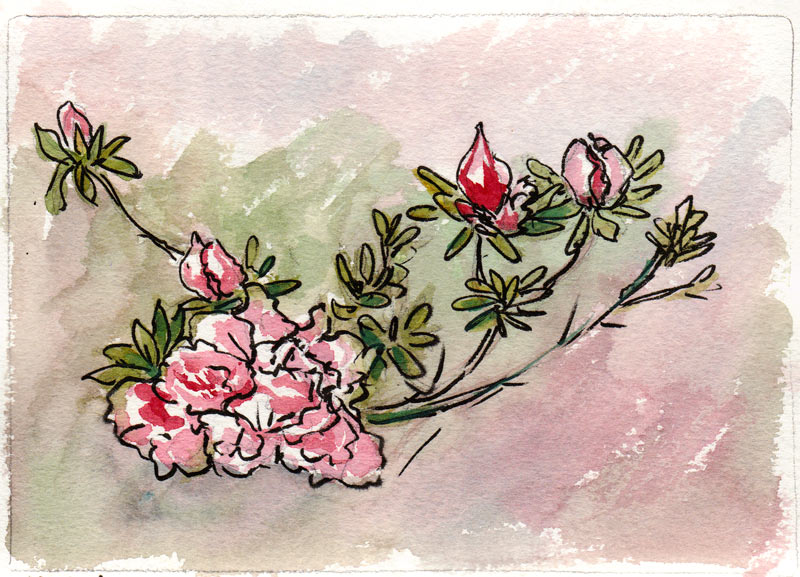 Meanwhile outside the sun was shining, the best weather in months, and I was sad that I was spending it indoors. Finally I finished the journal binding and went outside. This little plant (don’t know what it is; got it as a gift for my birthday last year and stuck it in the garden) was flowering and looked happy so I sat on the sidewalk in front of my house and quickly sketched and painted a bit of it as the sun went down.