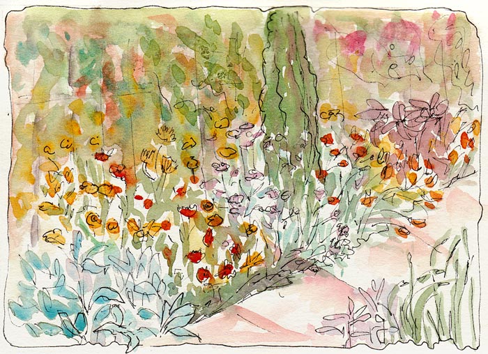 These are charming sketches! I’d love to see her garden – it seems to me that gardens in California are uniformly wonderful and lush. On a boo note – maybe now you (and Barbara) will want to read Michael Perry’s book Coop. My copy came in the mail yesterday, though I have intention of raising chickens.