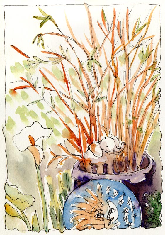 Barbara’s garden (photos from previous post) is abundant with flowers, vegetables, fruit trees, wild birds, her ceramic sculptures (the 3′ tall cactus above is actually made of glazed ceramic), her mosaics and the fabulous scent of healthy growing things. It’s a small garden in North Berkeley, but feels like a visit to the country far from urban stress. Her next door neighbors are musicians and so our sunset sketching was accompanied by birdsong and live music playing softly next door.