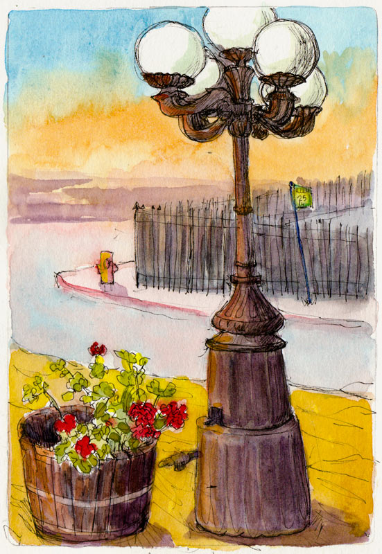I sketched this standing in the street on Northside, my back to Berkeley Natural Grocery. The street lamp must be left over from some previous incarnation of the corner. There are two of them, standing incongruously on each side of a funky little car repair shop. It took so long to draw the lamp that my sketchbuddies were ready to move on before I could draw the buildings on the next corner beyond the fence so I just threw in some paint for the sunset and the “distance.”