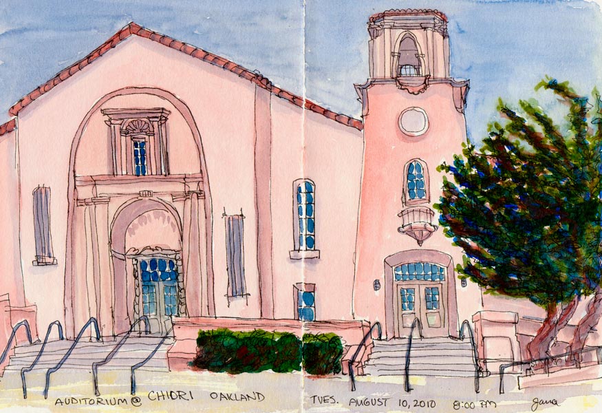 Micaela suggested the Children’s Hospital Oakland Research Institute (CHORI) building in North Oakland for our Tuesday night sketching and it was an interesting challenge. The 1923 building with 80,000 square feet of space was once a high school. Abandoned in the 1980s, it sat disintegrating for many years, with boarded up windows and peeling paint.