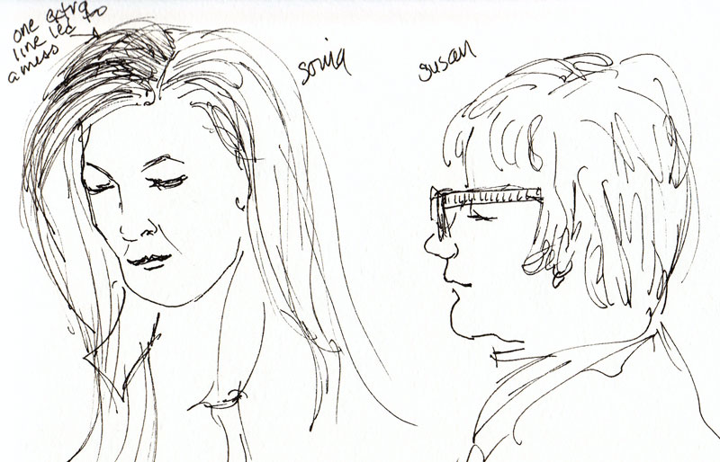 Then my first night back at Tuesday night sketching (at the Bread Workshop) after I drew my food I sketched the sketchers at my table. I had to add that shading to the right of Amy’s face to “erase” the splotch I made by her nose that looked like a booger.