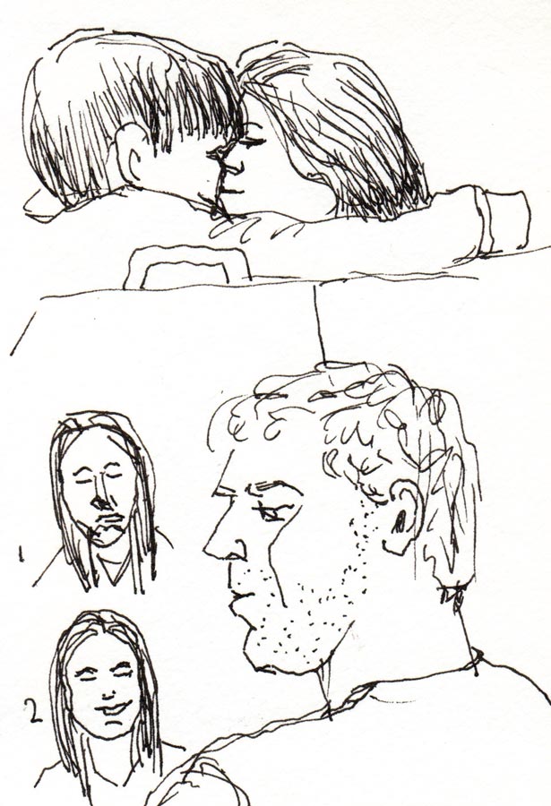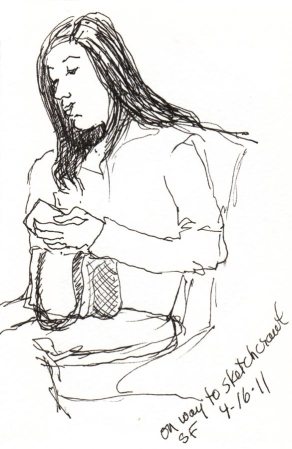 Below, some BART people on the very bumpy ride to SF. I’m finding that as much as I love my fountain pen for its smooth flowing, I have less control, especially when drawing on transit or when standing.
