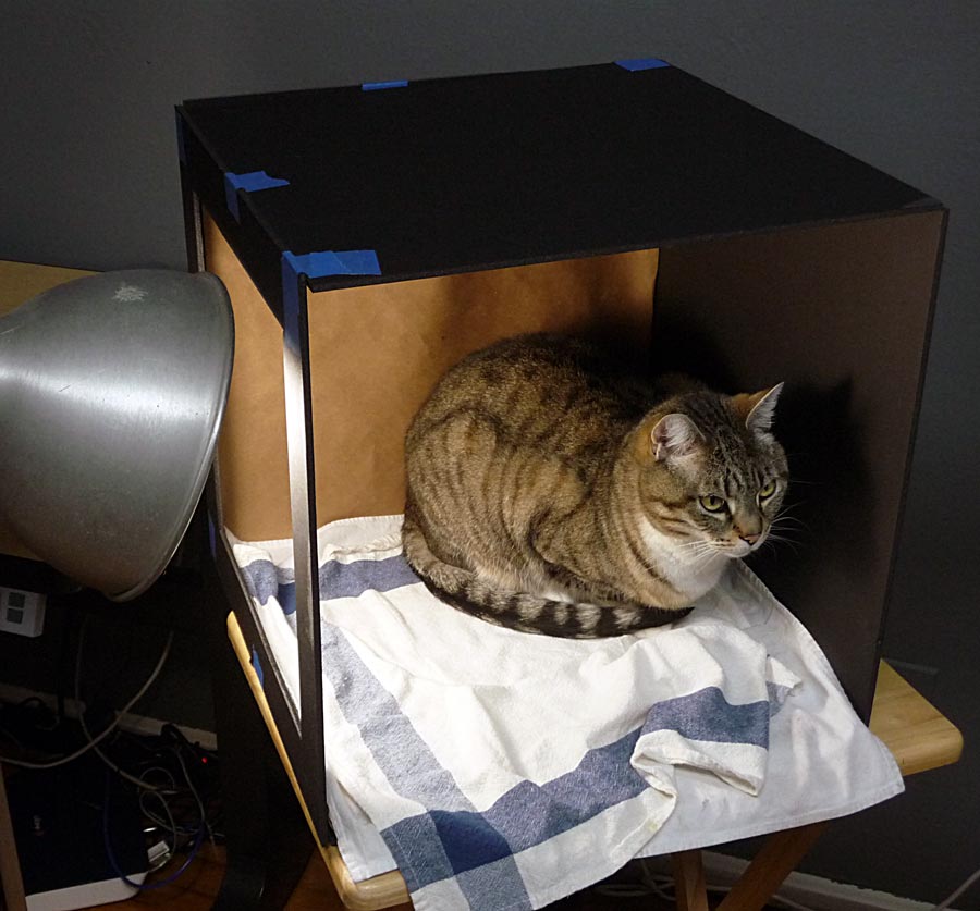 And here is the promised Still Life With Cat, shot when I put the radishes back in the fridge and silly Busby decided my still life light box would make a nice kitty sauna.