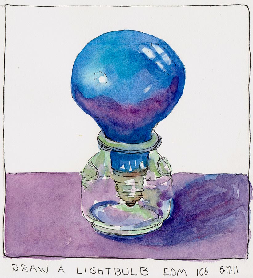 I was trying to find a way to make this old blue photography light bulb (purchased back in the days of film) stand up so I could sketch it. I tried using tape rolled into a double-sided ball and sticking it to the table but it fell over. Then I found this little glass yogurt container about the size of a baby food jar that I’d bought primarily for the jar. Perfect. (Sketched for Every Day in May, EDM #108).