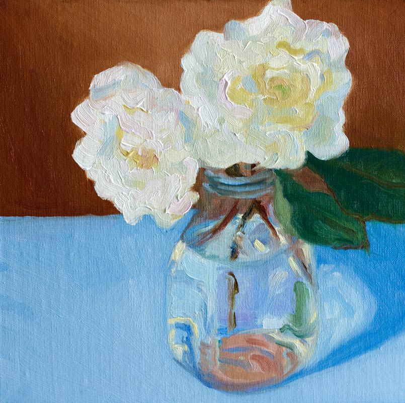 White Roses in Creamery Bottle, oil on linen, 8x8"
