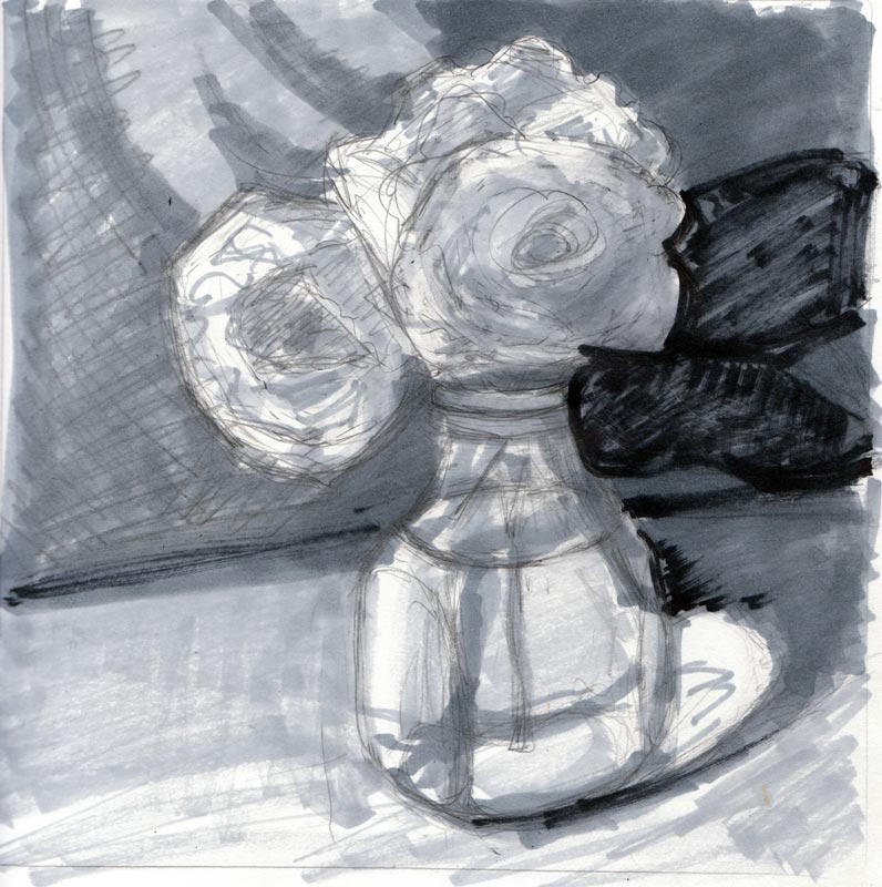Before I started the painting I did a quick same-size (8×8″) sketch and value study (below) with pencil and grey markers. I’ve found this is a critical step for me–it helps me find problems with composition. I corrected my original boring composition that had both the subject and the line between table and wall perfectly centered.