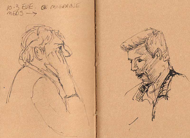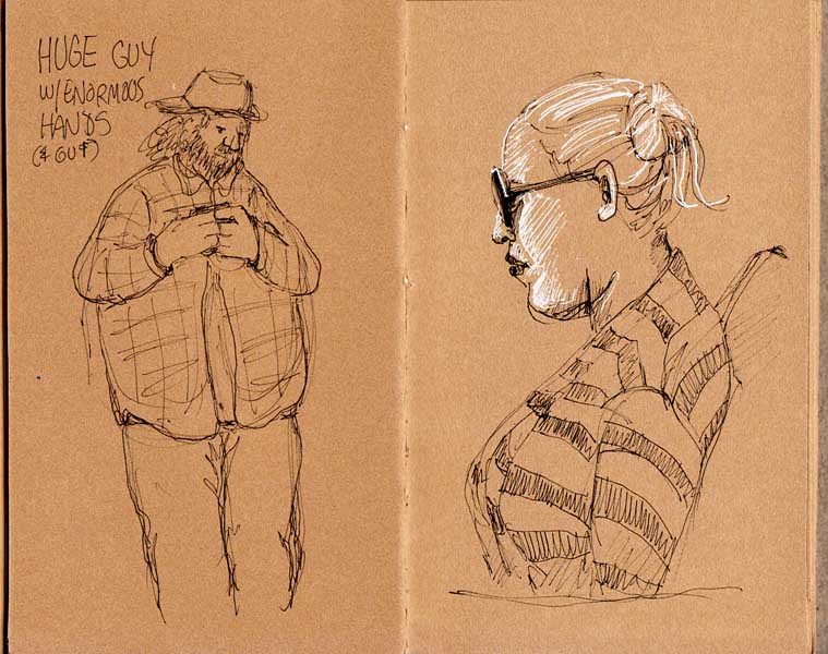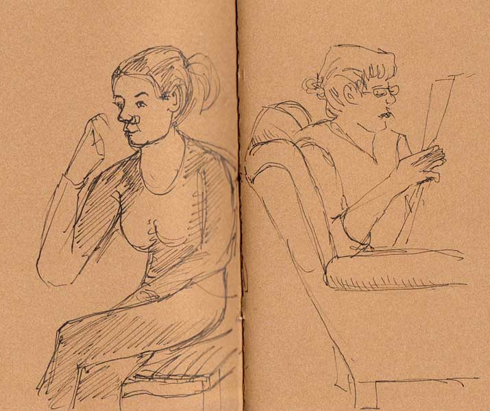 Since my sketchbook was small, pamphlet-bound (stitched down the middle only) with just 3 holes, I didn’t have trouble with the pages cracking like she did in her case-bound journal. I found the paper too rough for drawing with a fine point or fountain pen and settled on a Faber-Castell Pitt Medium pen. I also experimented unsuccessfully on one sketch with a white gel pen.