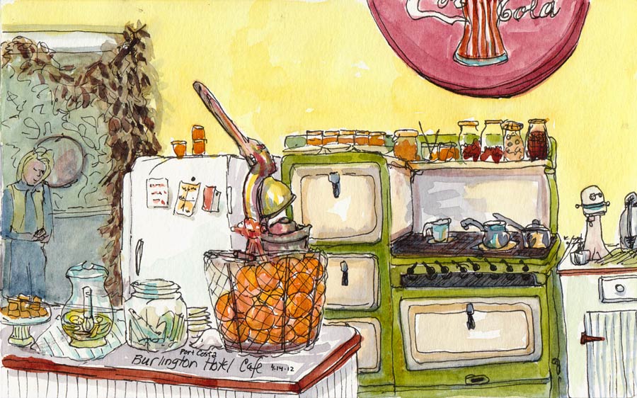 After my ordeal and late start I didn’t feel like setting up outside with the rest of my plein air group. I needed a place where I could relax and this charming café in the 100-year-old, disheveled Burlington Hotel was a delightful place to hang out.