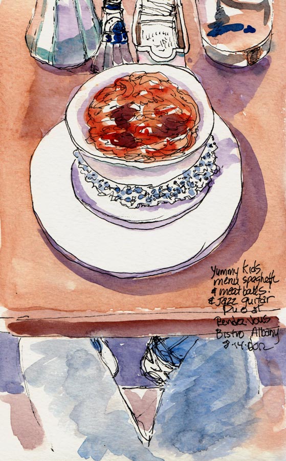 There was a guitar jazz duo playing lovely music and the waiter kindly let me order spaghetti and meatballs from the kids’ menu since I just wanted a small portion. As you can see in the sketch above, after I sketched my food on the table I continued down the page, over the binding, and sketched my legs and feet under the table.