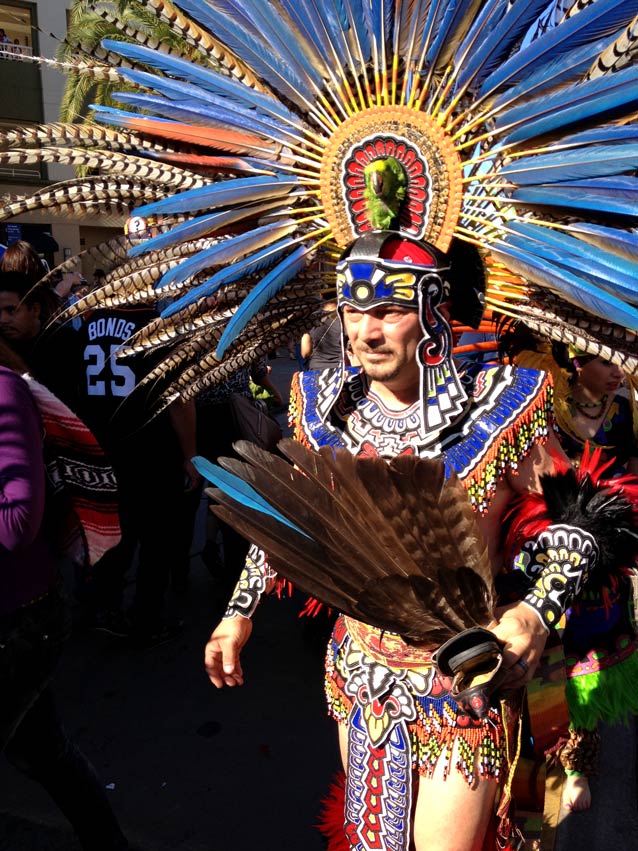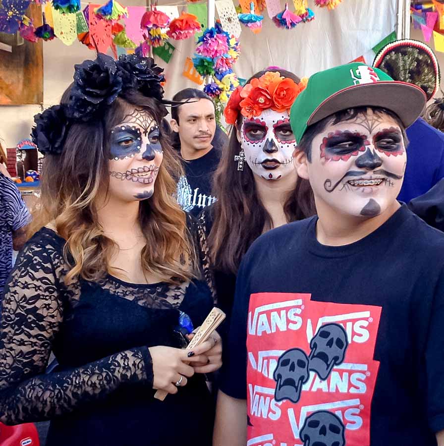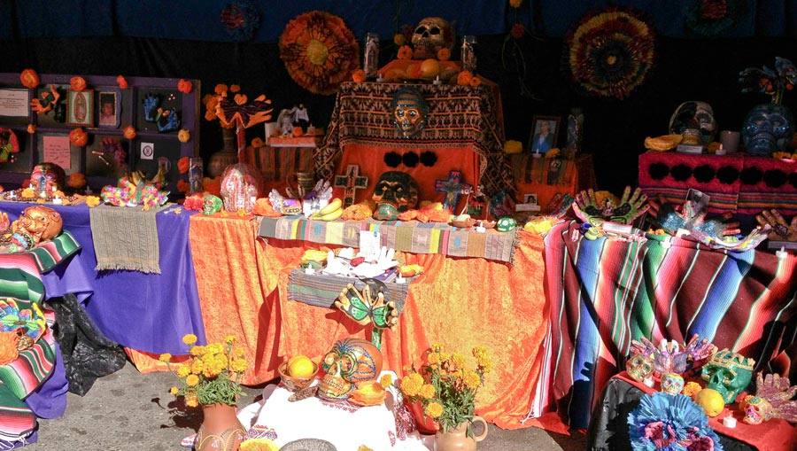 LOUD DRUMMING! Brilliant Colors! Aztec Dancers! Smoke from sage (and other “herbs”) and grilling meat! LOUD Bands! Dancers! LOUD Spanish radio stations broadcasting live! Sugar skulls! Costumes and painted faces! Marigolds everywhere!