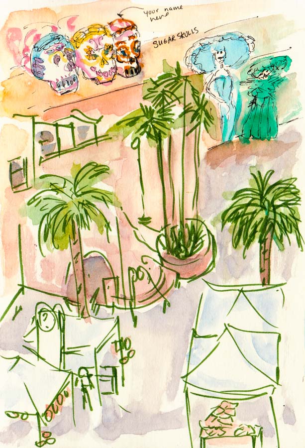 The first time I heard of Day of the Dead my 26 year old son returned from an extended trip to Mexico with ten small skeleton-like figures. He is now 38 and the figures are still in his old room upstairs. I think he attended a celebration very similar to what you describe. I really enjoy your watercolor, pen & ink sketches. The colors are so fresh & eye-appealing and you draw SO well. Thanks so much for sharing!