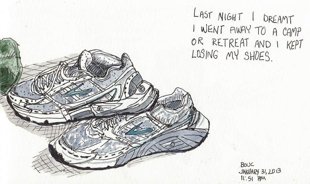 More crazy dreams! The night after the lost keys dream, I dreamed I was at a retreat where I kept losing my shoes. So of course I had to draw them, just to be sure they were still here.
