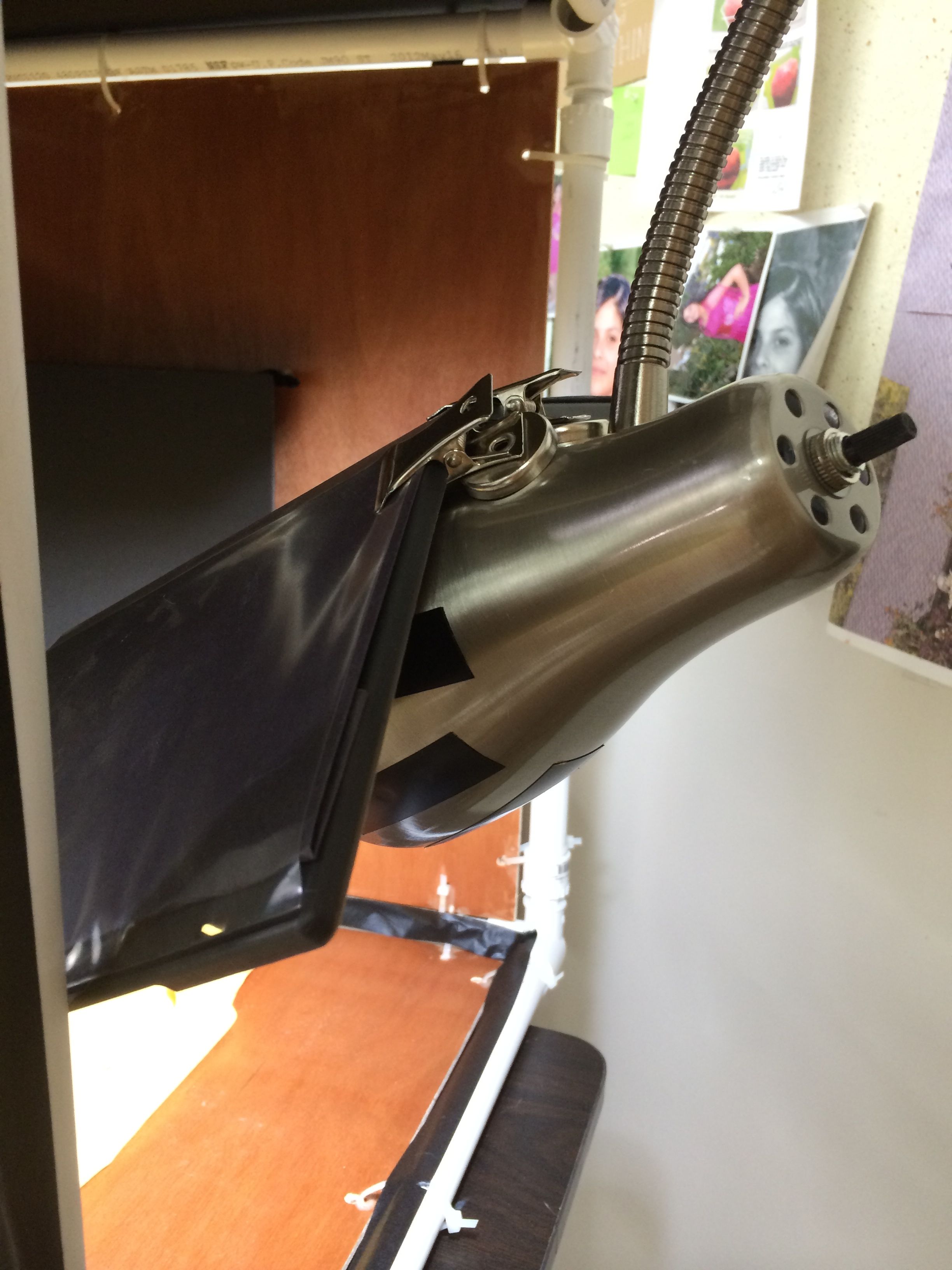 Clip on lamp with black tape over decorative holes, DVD cover attached to it with magnetic clamps