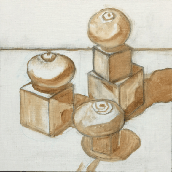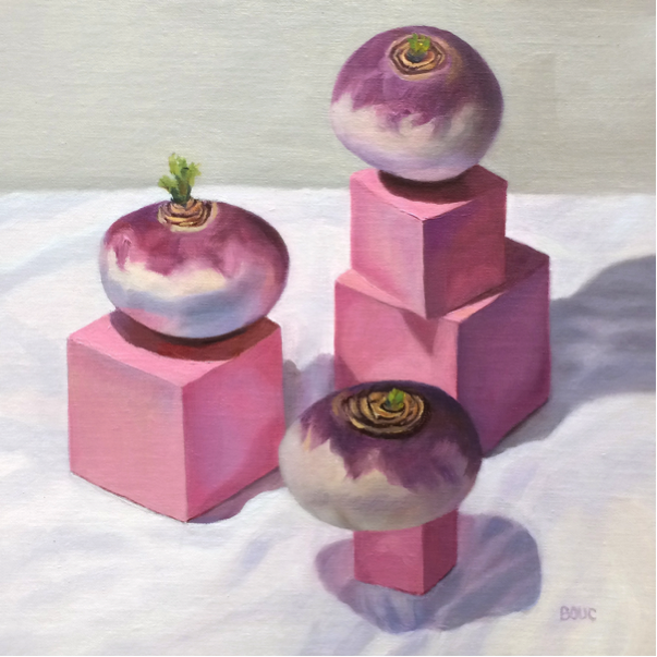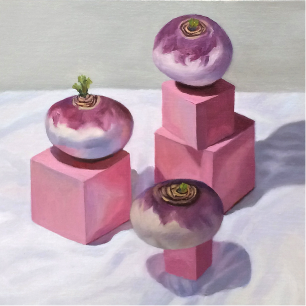 This painting was inspired by my neighbor’s childhood Montessori Pink Tower blocks arranged like a little cityscape on his coffee table. I found the blocks irresistible and had to paint them. The turnips I’d bought to cook for dinner seemed like a perfect addition (I know, I’m weird, right?) The painting is available on my Daily Paintworks gallery here.