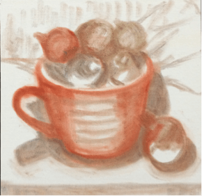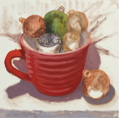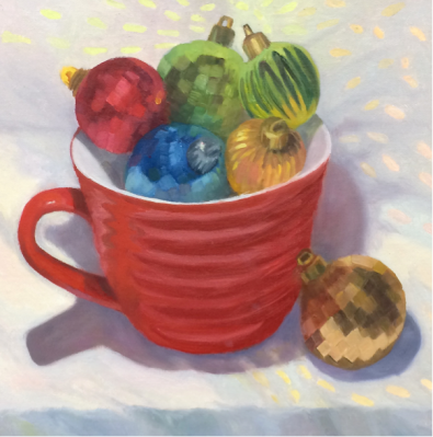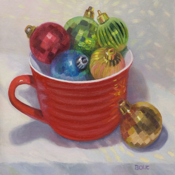 This is another painting (available here) in my “Found and Free” series: both the cup and ornaments were found on walks in “free” boxes set out on the curb.