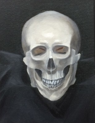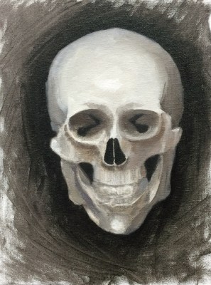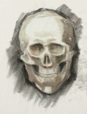 I painted my skull model, whom I call Mortie Skullman, to kick off my painting for 2015 since my plan for this year is to focus on portraits, mostly of people (but also of dogs of course, my favorite subject). The process I followed for this study was based on the approach David Jon Kassan takes on his online skull painting video, “Premier Coup” (only $1.95 to rent for 1 week). It was fun painting along with him, taking inspiration from the thoughts he shared as he worked.