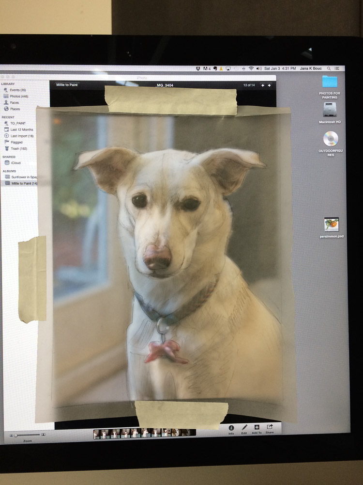 Drawing on tracing paper taped to iMac to compare and correct from photo