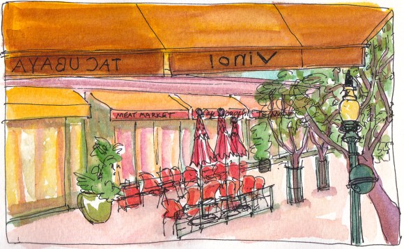 I’m going to post often for the next couple weeks to get caught up on all the things I haven’t posted because of continually choosing painting over posting. I’m also going to try to write less and keep it simple so that I can get the images online quickly and get back in the studio. So here are 4 sketches that got orphaned from last year. Above is the view from a table under the awning outside Tacubaya on 4th Street in Berkeley.