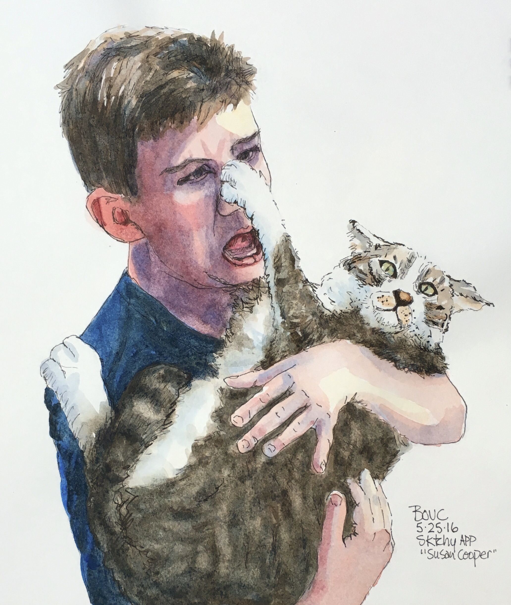 sketched in ink and watercolor from a SktchyApp photo, 10×9″The cat’s expression (and the boy’s) perfectly replicate mine the past few days of dealing with some tough family stuff. But drawing helps keep me sane. This was sketched from Susan Cooper’s photo on SktchyApp. Ink and watercolor 12×9″.