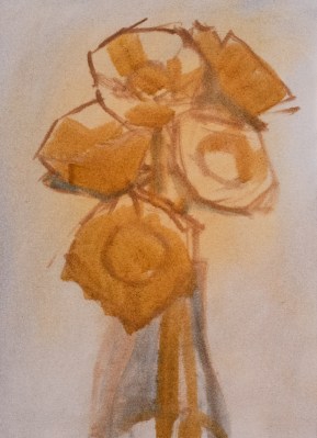 I tried making the background out of Gamblin’s Portland Greys with a little color added. It turned out really dead. I gave up on this painting after fussing with the bottle and loosing patience with it and the dull look of the background and the lack of value contrast in the flowers. I had some good values at first and then turned it all into mid-tones as I worked too long.
