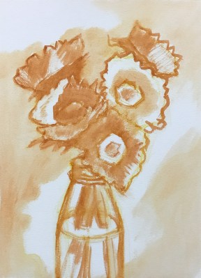 I always like the sketchy block in phase better than the finished painting–although I wouldn’t call this a finished painting. I went as far as I could until I would have had to scrape or rework but stopped instead, having had just about enough of sunflowers for now.