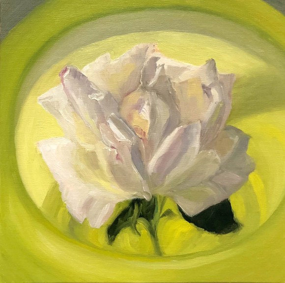 I’ve been working on doing Alla Prima (all at once) paintings in order to become more decisive about the paint I put down instead of noodling around. It requires getting the drawing right, understanding what I’m seeing and if it fails, starting again instead of trying to keep fixing, which usually goes badly. This was the third attempt at painting a rose in my mom’s yellow glass bowl. The previous attempts and photos of the set up (as the rose opened) are below.