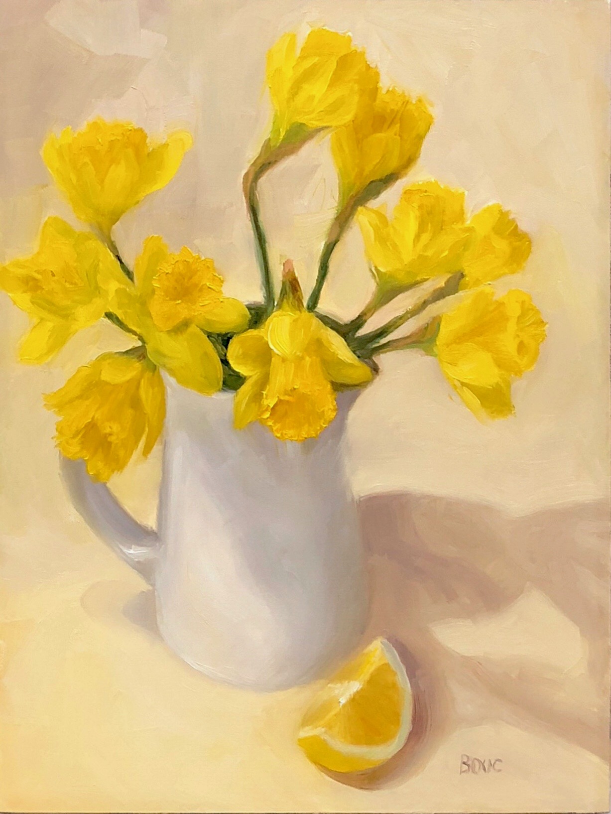 Daffodils in White Pitcher and a Lemon, oil on panel, 12×9” Available here
