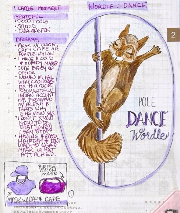 Above is the two-day, two-page spread; keep reading to see the individual pages with the stories below in this continuing journal series of the day’s Wordle and my wacky dreams.