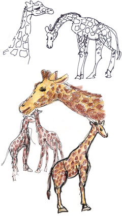Judith and I planned to go to the International Sketchcrawl in San Francisco today but realized we weren’t in the mood for the urban jungle and went to see real jungle animals instead. We spent a lot of time sketching the two baby giraffes playing together and being cared for by their families until we got too hot sitting in the sun so we looked for a cooler spot. That’s when we found the fruit bats. They look like fuzzy brown otters wrapped in black leather umbrellas. It was amazing watching them unfurl a huge wings in order to better block the sun from their eyes or adjust which of their many hooks they were hanging from as they slept. From what we could tell with them all wrapped up by their folded wings and hanging upsidedown, they have several long talons on each foot and then another convenient hook at the end of each wing. Their wings looked like the finest leather and their furry teddy bear bodies looked very cuddly. Ink and watercolor pencils in sketchbook.