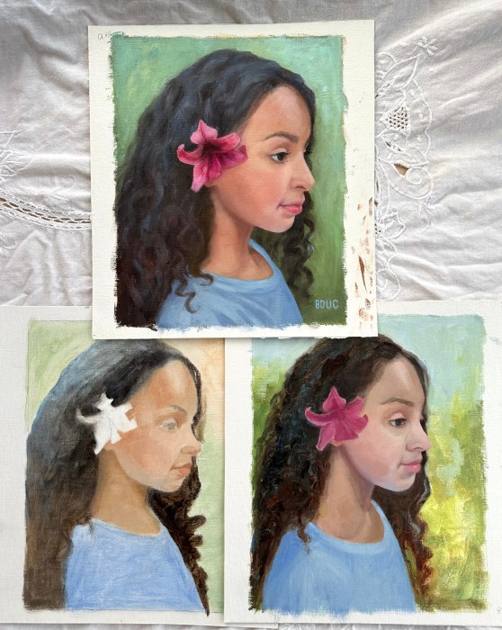 Below are my two preliminary pencil drawings and the painting, second layer done. I should have left it as it was—blocky, but fresh. Instead I labored over it, trying to match values and colors to the original despite the crazy palette.