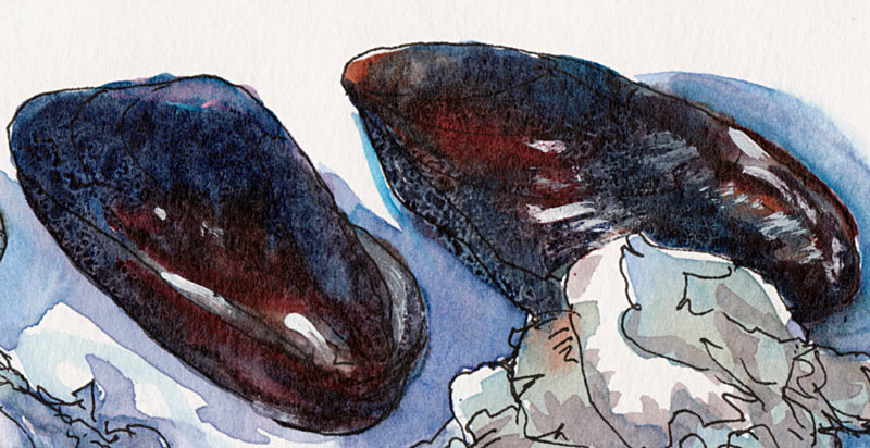 When I added m ore watercolor at home to the BLT (left page above) I must have closed the book too soon because the pages glued themselves together. When I tried to separate the pages, part of my sandwich stuck to the other side. Not only did that ruin the sandwich but also a small ink drawing I’d liked on the other page.