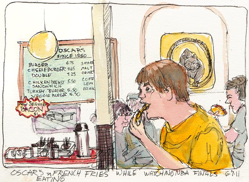 I enthusiastically joined my Tuesday night sketch buddies for dinner, beer and sketching at Elevation 66, the new El Cerrito brew pub. I loved my dinner, displayed above, (a “small plate” combo so weird I couldn’t resist: grilled squid slices on spicy avocado sauce beside little blobs of grapefruit foam/gel (“to cleanse the palate”) and spicy deep-fried rice fritters. Odd but yummy!